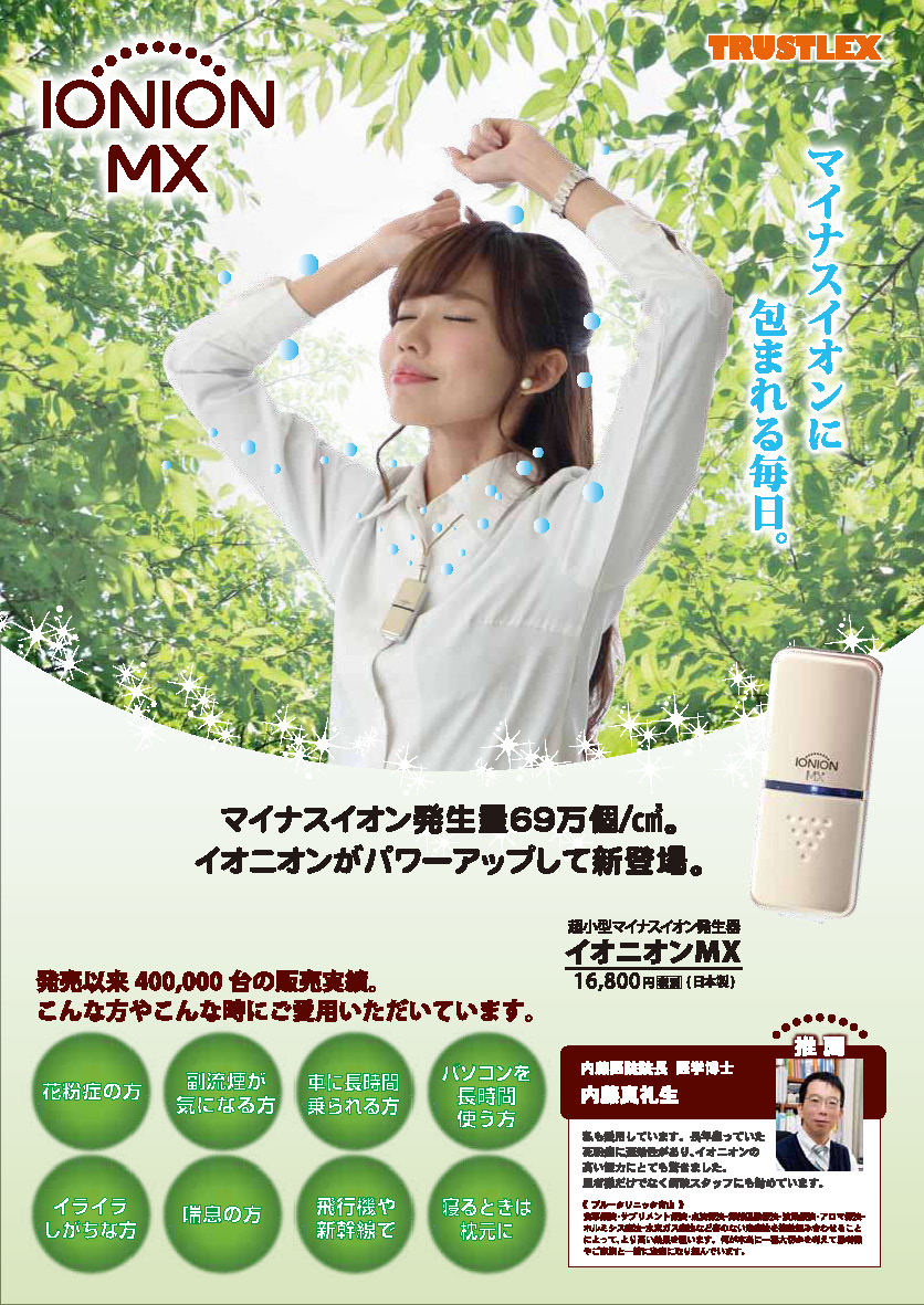 kenbi100 イオニオンEX 超小型マイナスイオン発生器 ウイルス対策はこれ!! マイナスイオンによる感染予防 その他こんなお悩みにも・・ 花粉症・PM2.5・喘息 長時間のパソコン作業・運転 副流煙が気になる すぐにイライラする 18,480円 (税込価格) 数量: 選択