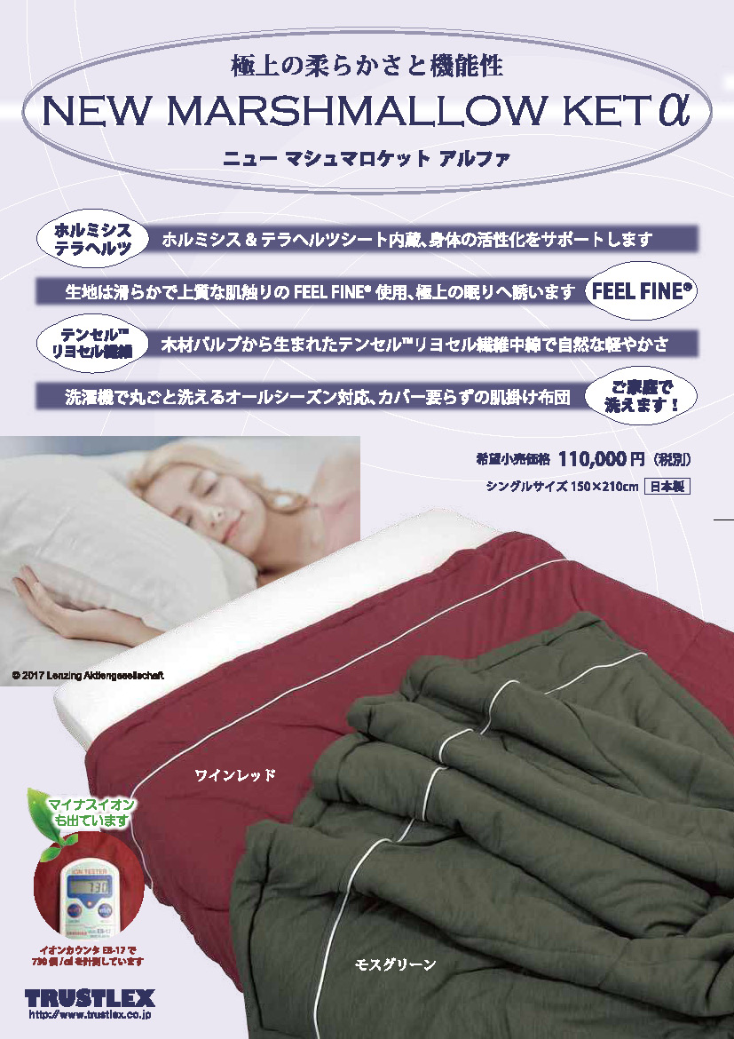 kenbi100 ニューマシュマロケットα 極上の柔らかさと機能性 ニューマシュマロケットα ホルミシス&テラヘルツシート内蔵で 身体の活性化をサポート 上質な手触りと森林生まれの繊維は カバー無しで使いたい優しさ 121,000円 (税込価格) 数量: 選択