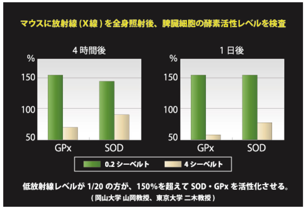低放射線ホルミシスに関連する実験は、日本国内の研究所や各地の大学でさらに進んでいます。数々の研究論文も発表されるなか、低放射線ホルミシス の基礎的実験は十分に行われたという段階まできています。活性酵素を抑制する抗酸化酵素「SOD(スーパーオキシド・ジムスターゼ)」と「GPx(グルタ チオン・ペルオキシダーゼ)」は、低放射線ホルミシスによって飛躍的な増加が見らます。岡山大学の山岡聖典教授と東京大学の二木鋭雄教授による実験では、 このSODとGPxのレベルが150%増加することが、東京大学先端科学技術研究センターで行われたマウスのエックス線の全身照射により確認されました。