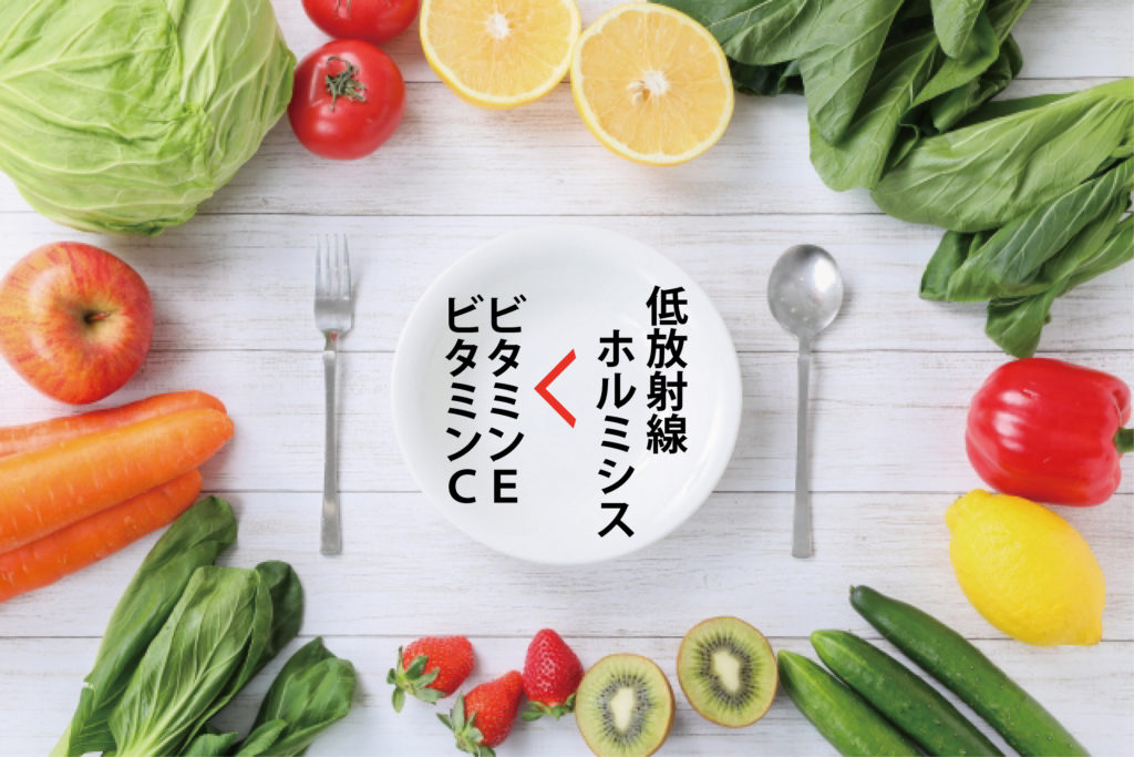 活性酸素を打ち消す抗酸化作用としては、ビタミンCやビタミンEの摂取がいいといわれています。しかし、そのビタミンCやビタミンEとは段違いの抗酸化作用を促すことが低放射線にはできることがわかりました。